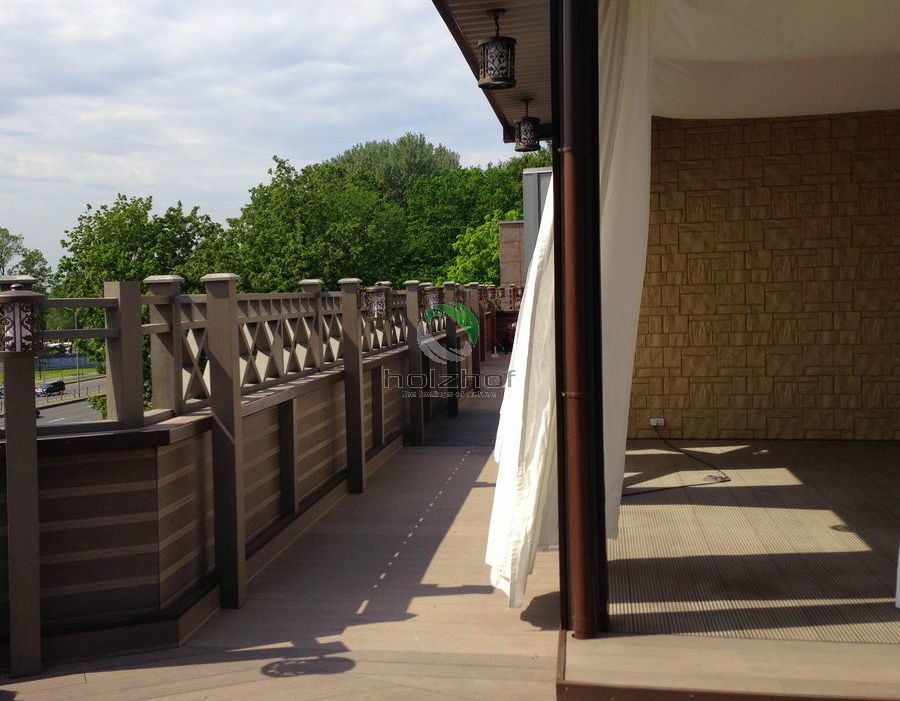 Монтаж был осуществлен бригадой наших монтажников. Все стационарные элементы конструкций, таких как веранда, парапеты, переходы, лестницы столбы и т.п. были обшиты именно террасной доской ДПК Holzhof. Обращаем Ваше внимание, что именно эта доска имеет целый ряд преимуществ для использования ее на коммерческих объектах: